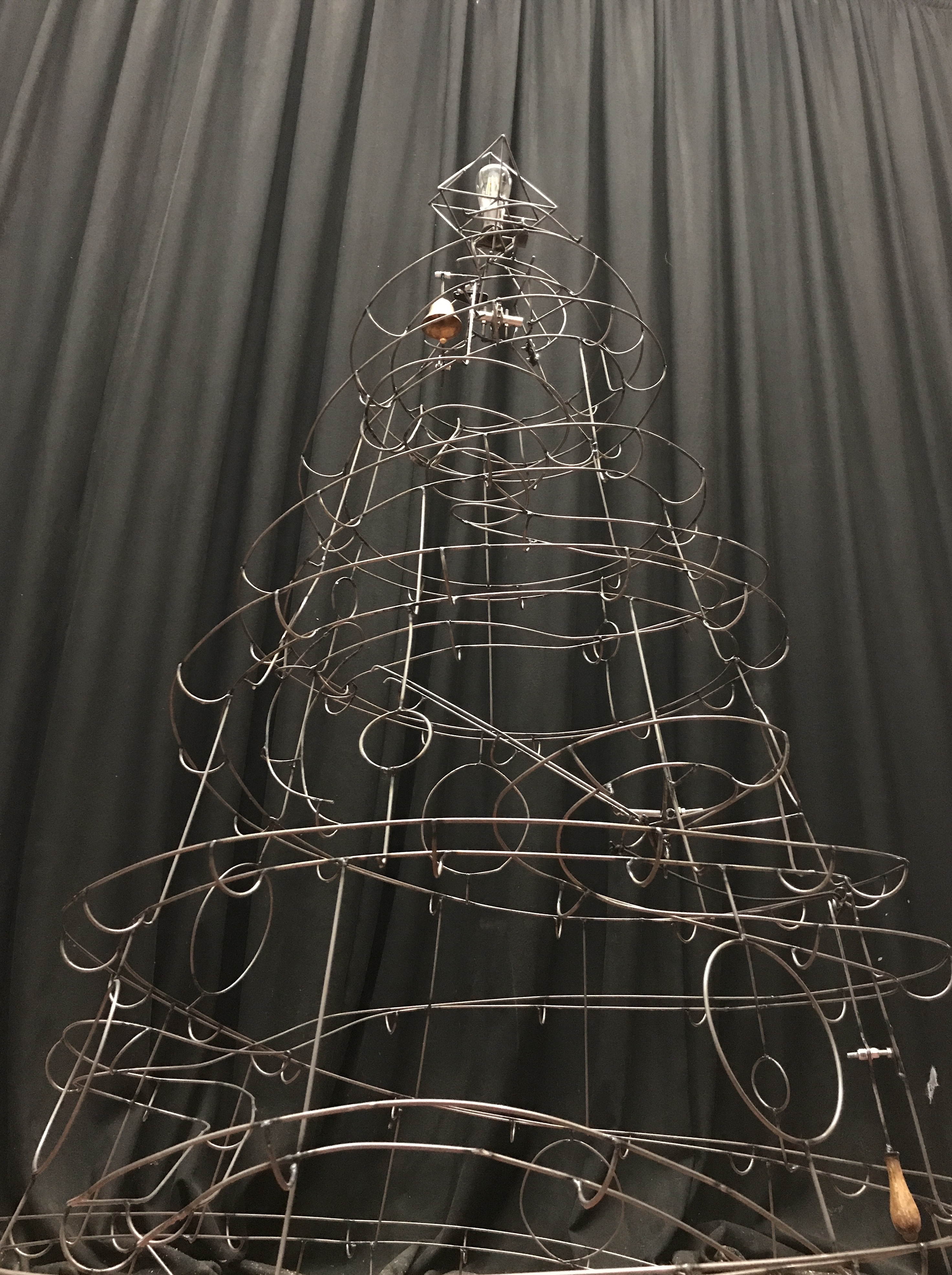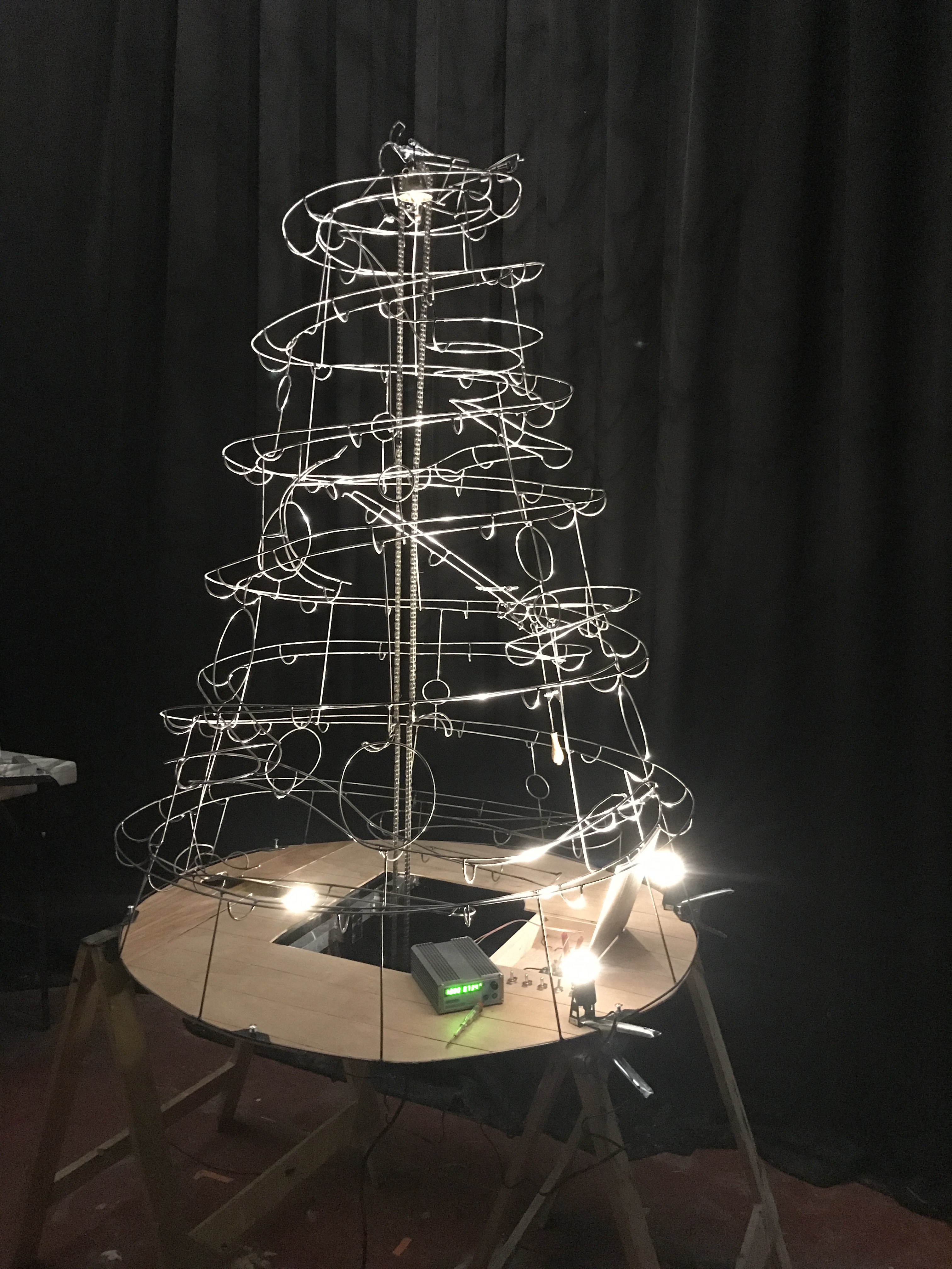 Brief: One of my own creations, design and make a large kinetic ball run sculpture which is operated by audience members and shaped like a Christmas Tree. The Tree also needed to be able to roam around spaces so it could be used as a walkabout performance or static installation.