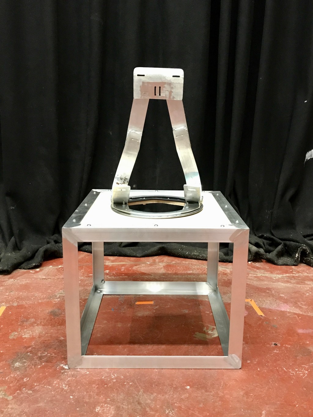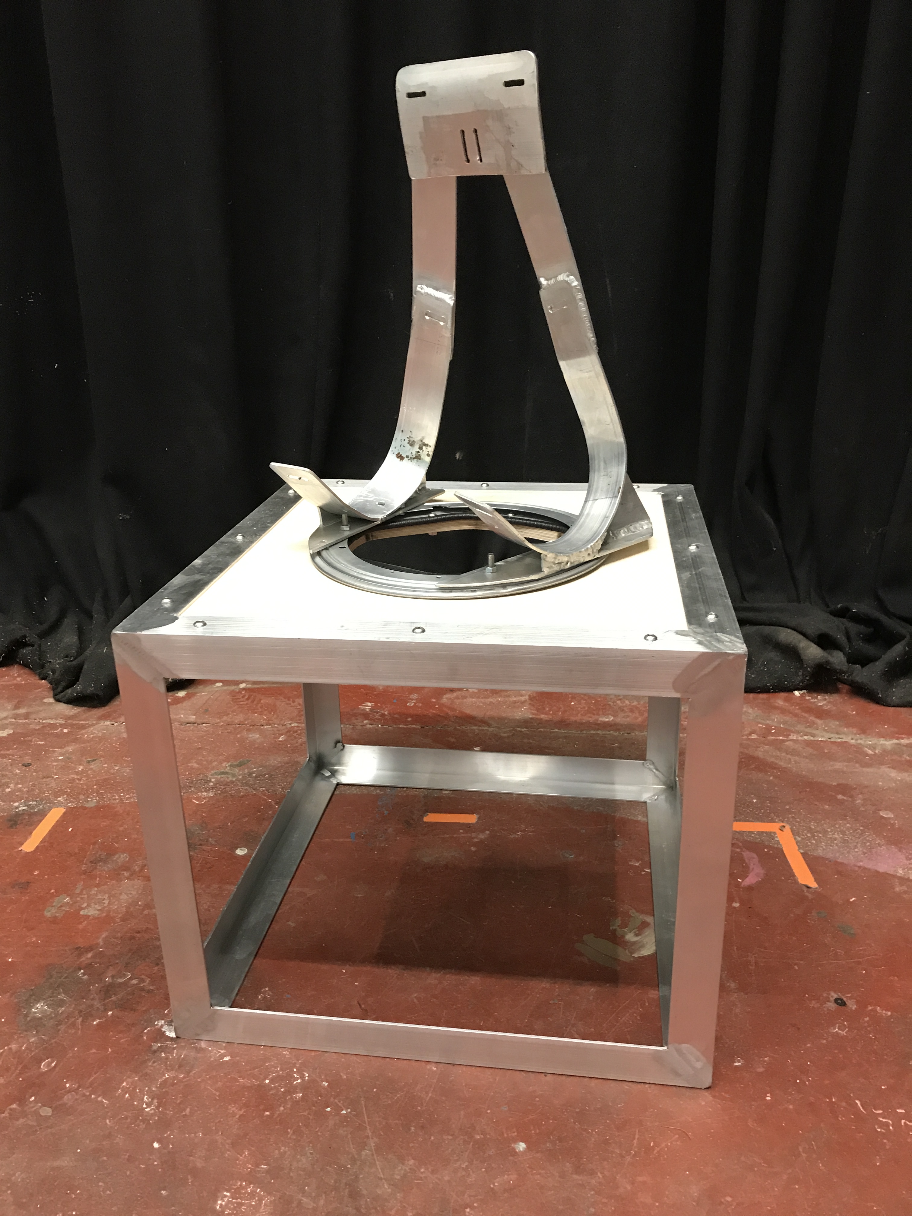 Brief: To make an aluminium Cube with a back support and a large bearing so the dancer could put their head in the box and do a “head stand” without use of their hands and also spin around. I only made the frame, back support and spinning element, Trash Dollys did the lighting and perspex/acrylic.